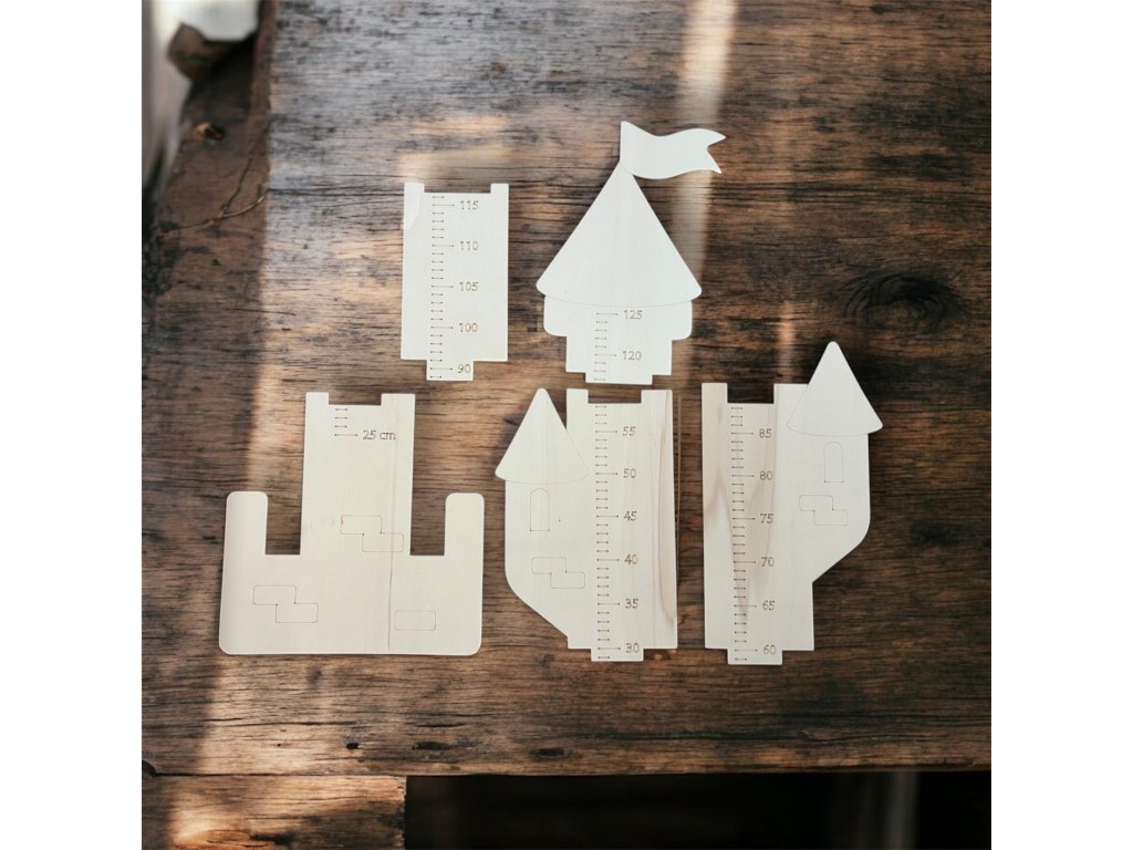 Dětský nástěnný metr s motivem hradu je dřevěný polotovar určený k vlastnímu dotvoření. Tvarově je řešen jako hradní věž s doplňkovými prvky, které společně tvoří výrazný a přehledný růstový metr vhodný do dětského pokoje.