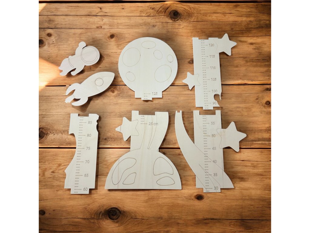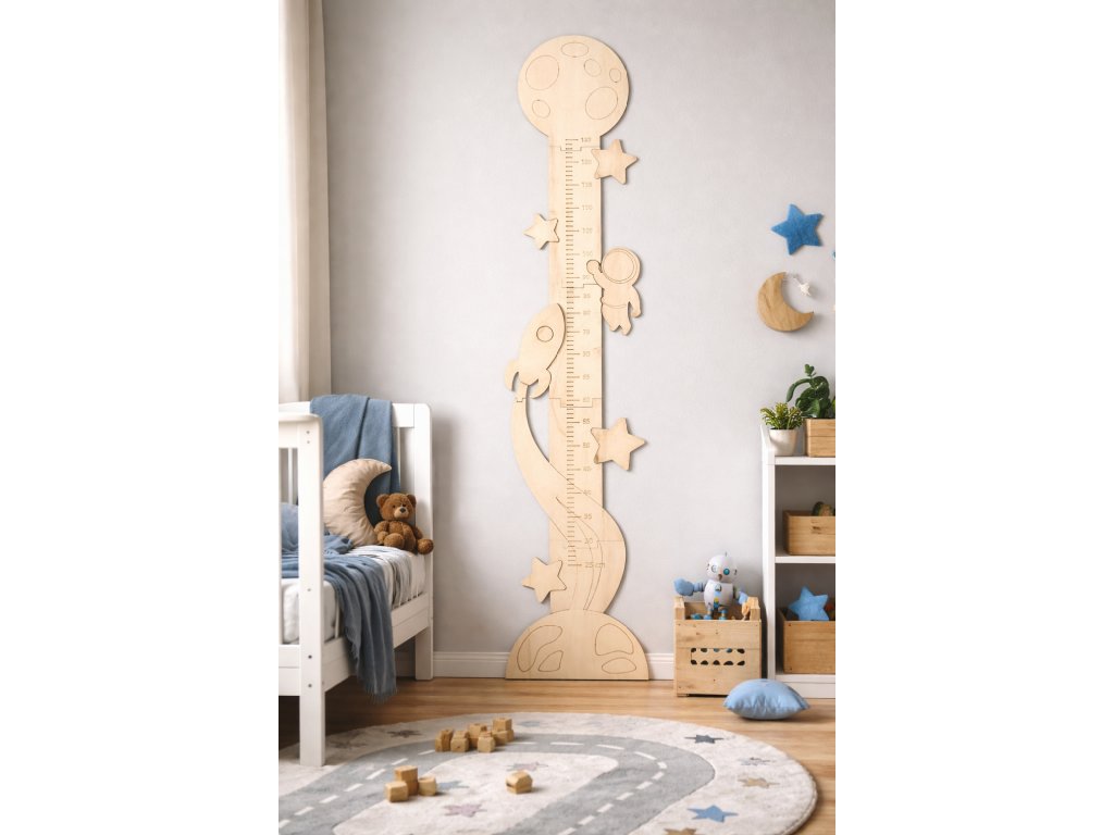 Dětský nástěnný metr s vesmírným motivem je dřevěný polotovar určený k vlastnímu dotvoření. Motivy inspirované vesmírem – raketa, astronaut, hvězdy a planety – tvoří hravý základ, který lze dále upravit podle vlastního stylu a interiéru.