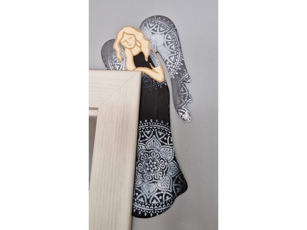 Originální dekorace vyřezaná z 3mm topolové překližky ve tvaru anděla. Je určená k umístění na vyčnívající rám dveří, kde působí jako hravý a nečekaný doplněk interiéru.