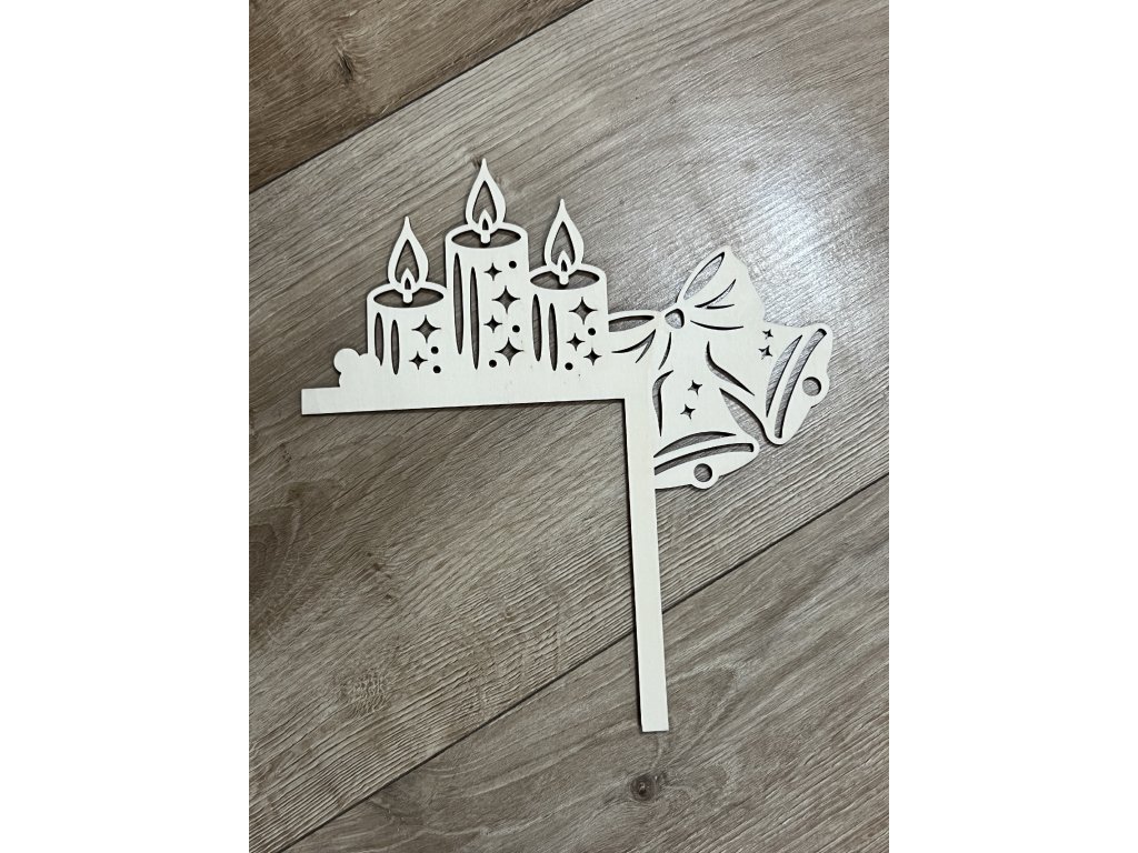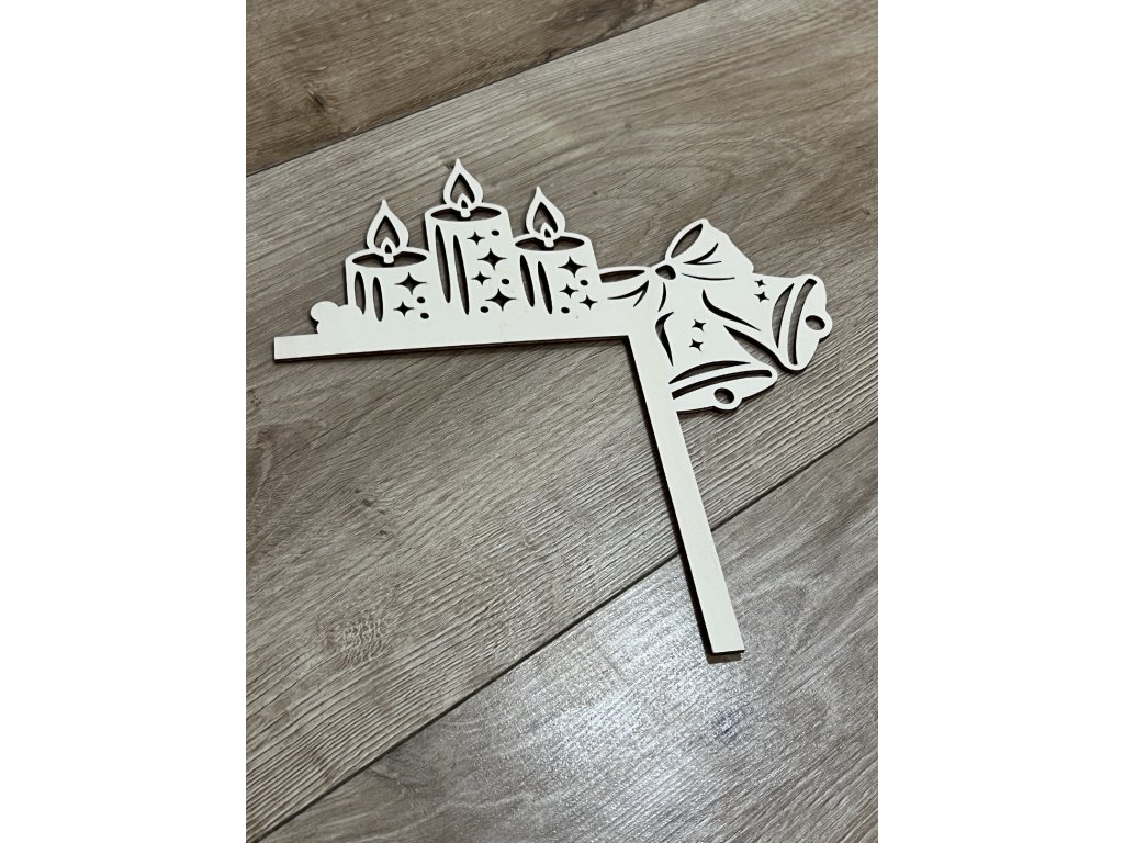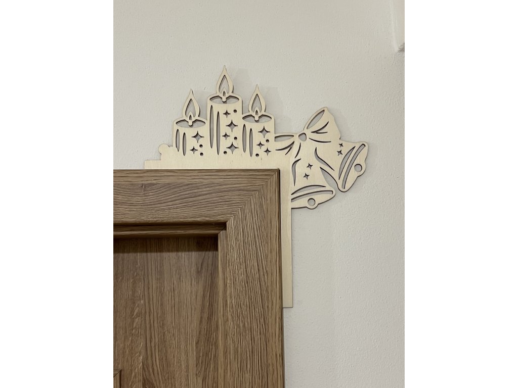 Elegantní vánoční dekorace se svíčkami a zvonky, určená na ozdobení rohu dveří nebo zárubní. Výřez je vyrobený z lehké 3mm topolové překližky a díky prodlouženému jazýčku se snadno zasune mezi dveře a rám.