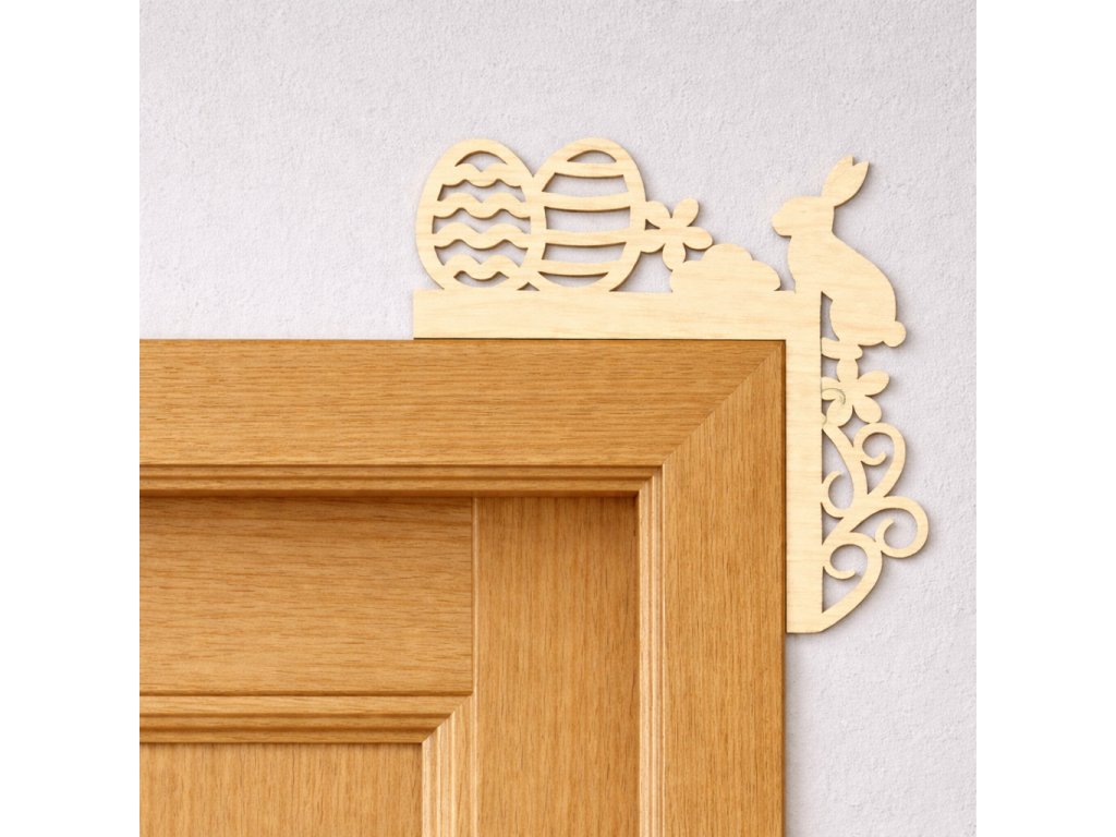 Jemná dřevěná dekorace určená k umístění na roh dveří nebo rámu. Motiv velikonočního zajíčka s vajíčky doplněný o rostlinné ornamenty působí lehce a nenápadně, přesto prostor příjemně oživí.