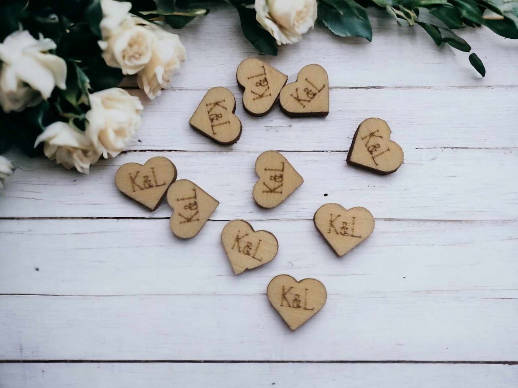 Dřevěná srdíčka s vlastními iniciály na vývazky.