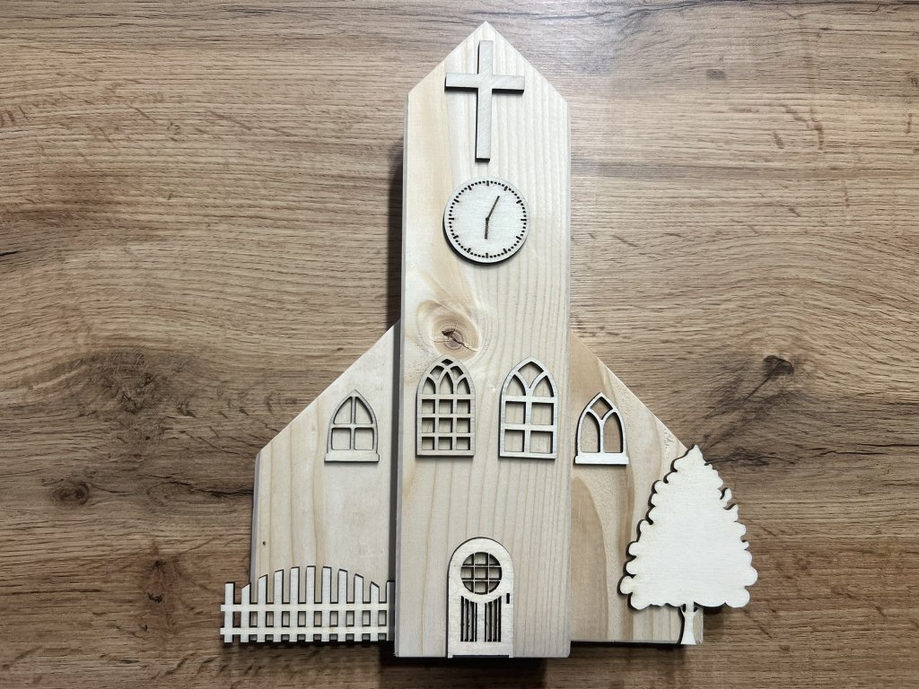 Dřevěný kostel z masivu šířka:19 cm, tloušťka 4 cm – polotovar pro tvoření