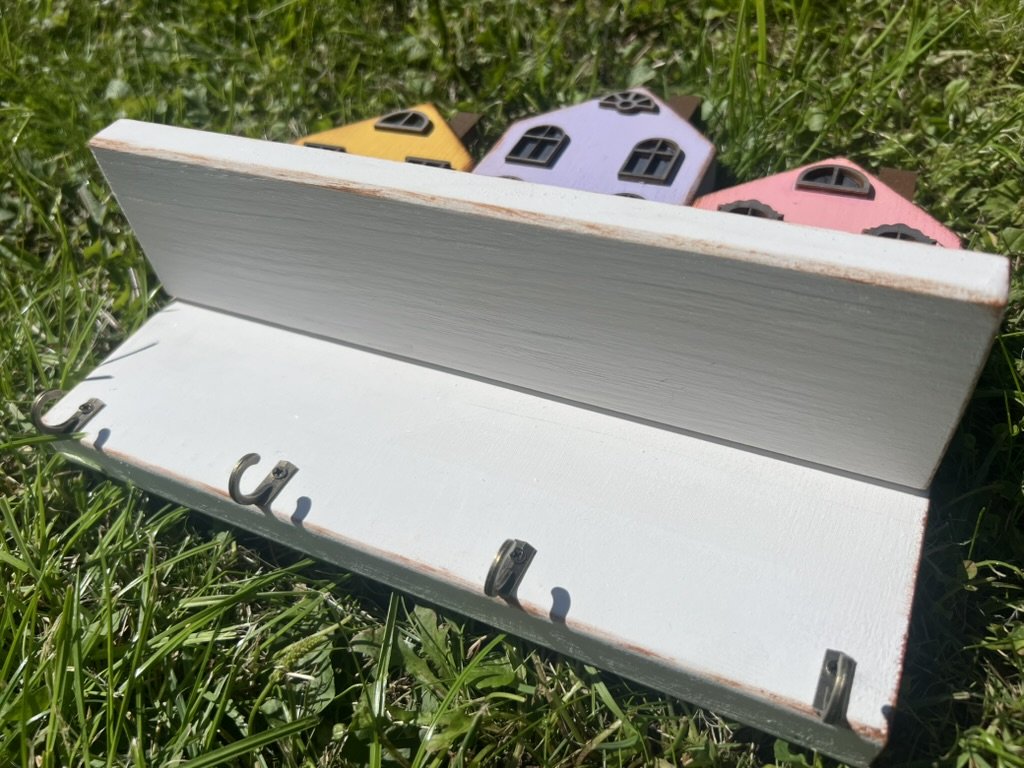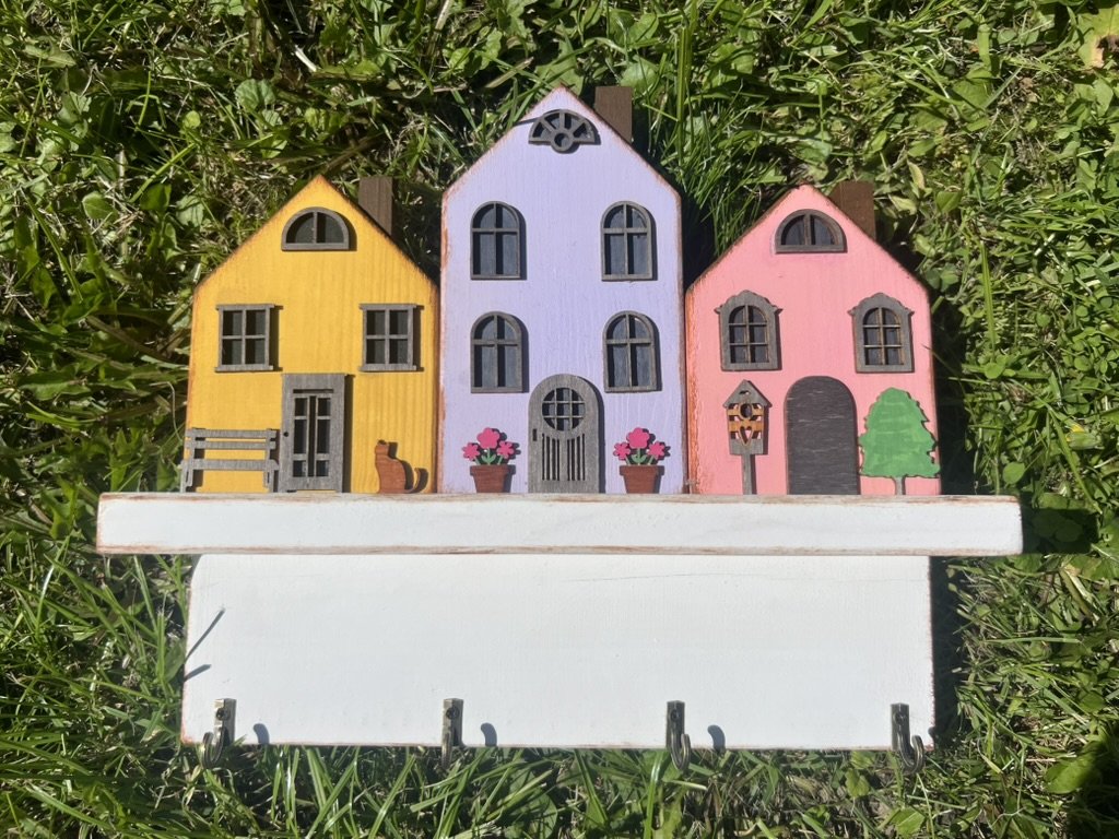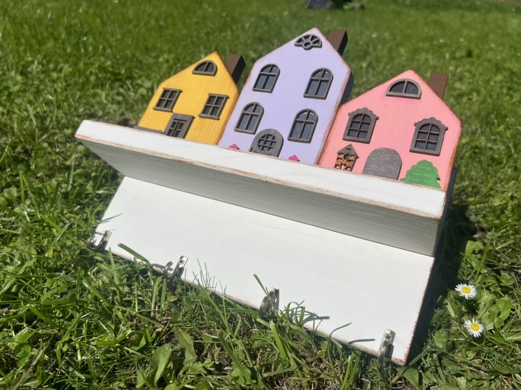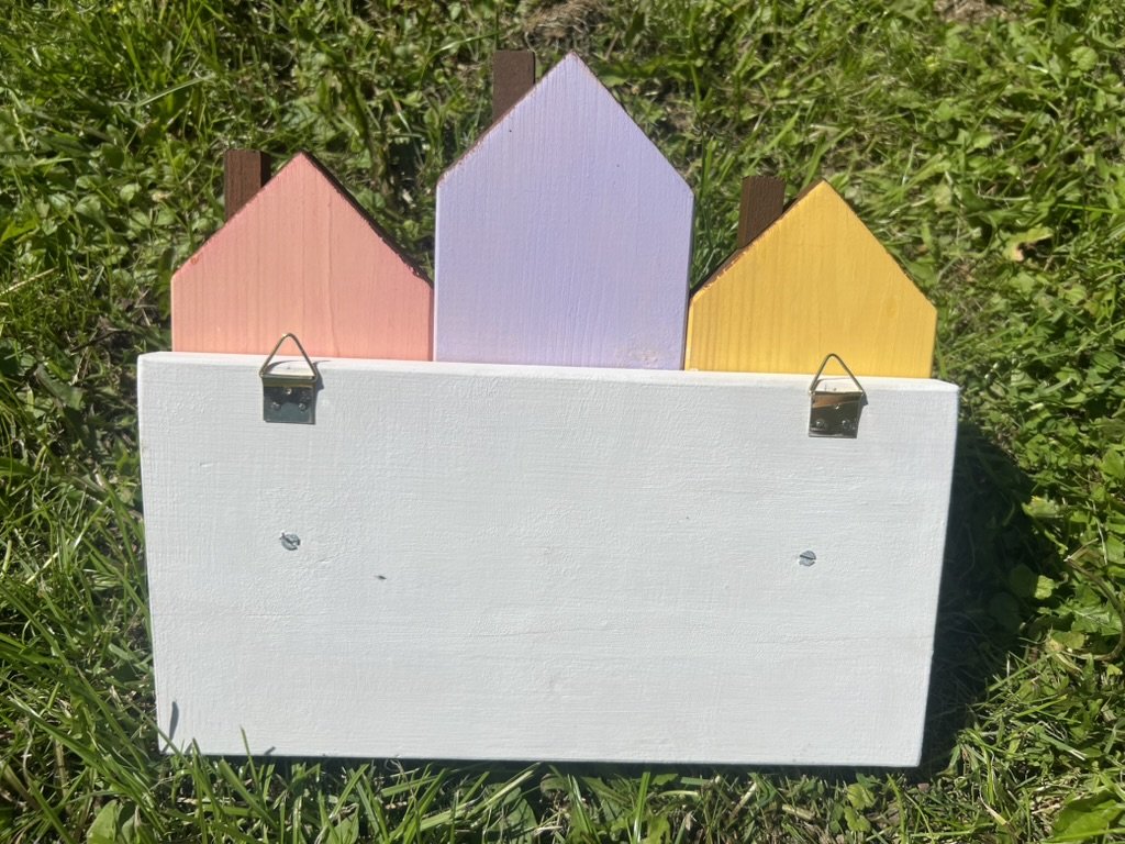Originální dřevěný věšák na klíče, který zaujme barevným a hravým vzhledem. Přední část zdobí tři domečky v odstínech žluté, fialové a růžové, doplněné o ručně malované detaily – lavičku, pejska, květiny, strom a ptačí budku.