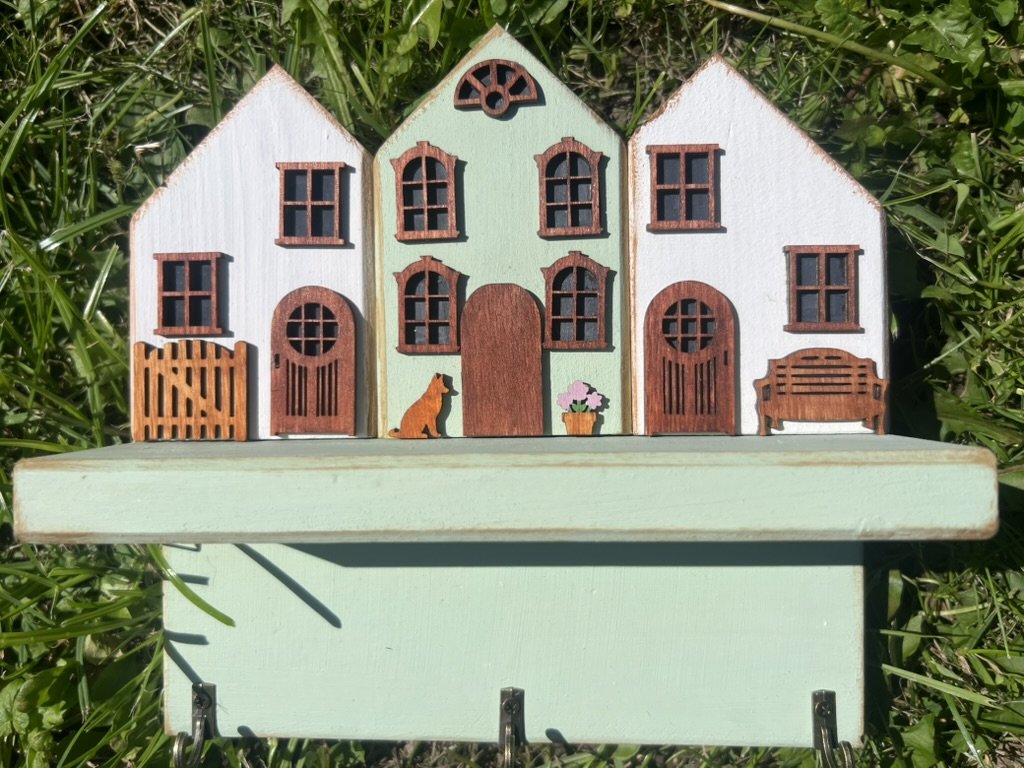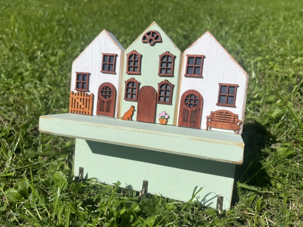 Dřevěný věšák na klíče s poličkou – ulička domečků, ručně malovaný