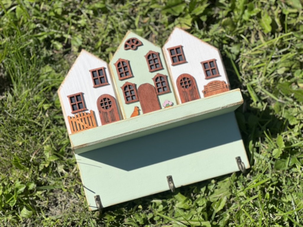 Stylový dřevěný věšák na klíče, který spojuje praktičnost a originální vzhled. Přední část zdobí tři detailně malované domečky s doplňky – plotem, lavičkou, květinami i pejskem. Každý kus je pečlivě ručně malovaný akrylovými barvami a doplněný o dřevěné prvky, takže je vždy naprostý originál.
