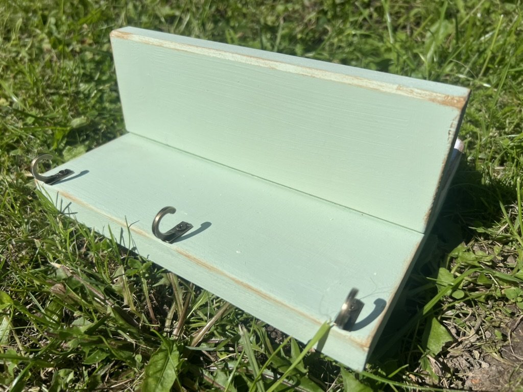 Věšák má praktickou poličku a pod ní tři kovové háčky na klíče. Na zadní straně jsou dva kovové háčky pro snadné zavěšení na zeď. Hodí se jako funkční doplněk i krásná dekorace do předsíně, kuchyně nebo chalupy.