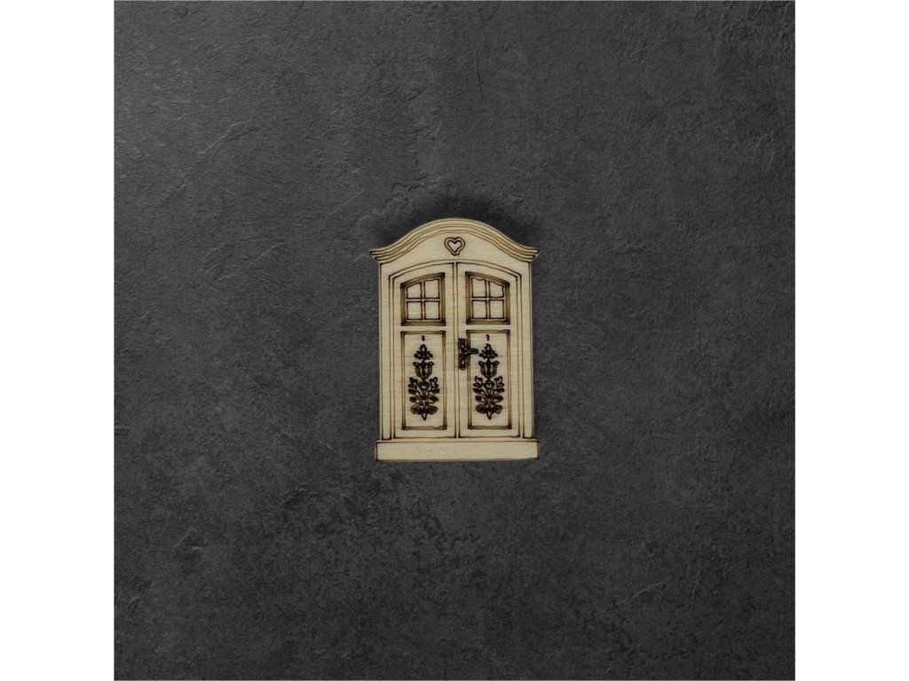Dřevěný výřez dvojitých dveří se srdíčkem a květinovým motivem je výrazný dekorativní prvek z překližky, který doplní vaše domečky i další kreativní projekty. Gravírované detaily zvýrazňují jednotlivé části dveří – výplně, okýnka, madlo i jemné rostlinné motivy.