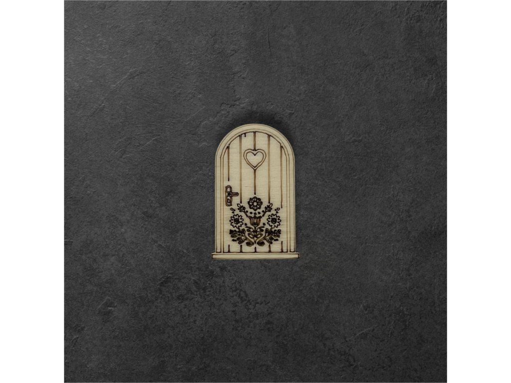 Dřevěný výřez obloukových dveří se srdíčkem a květinovým motivem je dekorativní prvek z překližky, který doplní vaše domečky i další kreativní projekty. Gravírované detaily zvýrazňují jednotlivé části dveří – strukturu prken, madlo, srdíčko i jemný květinový motiv ve spodní části.