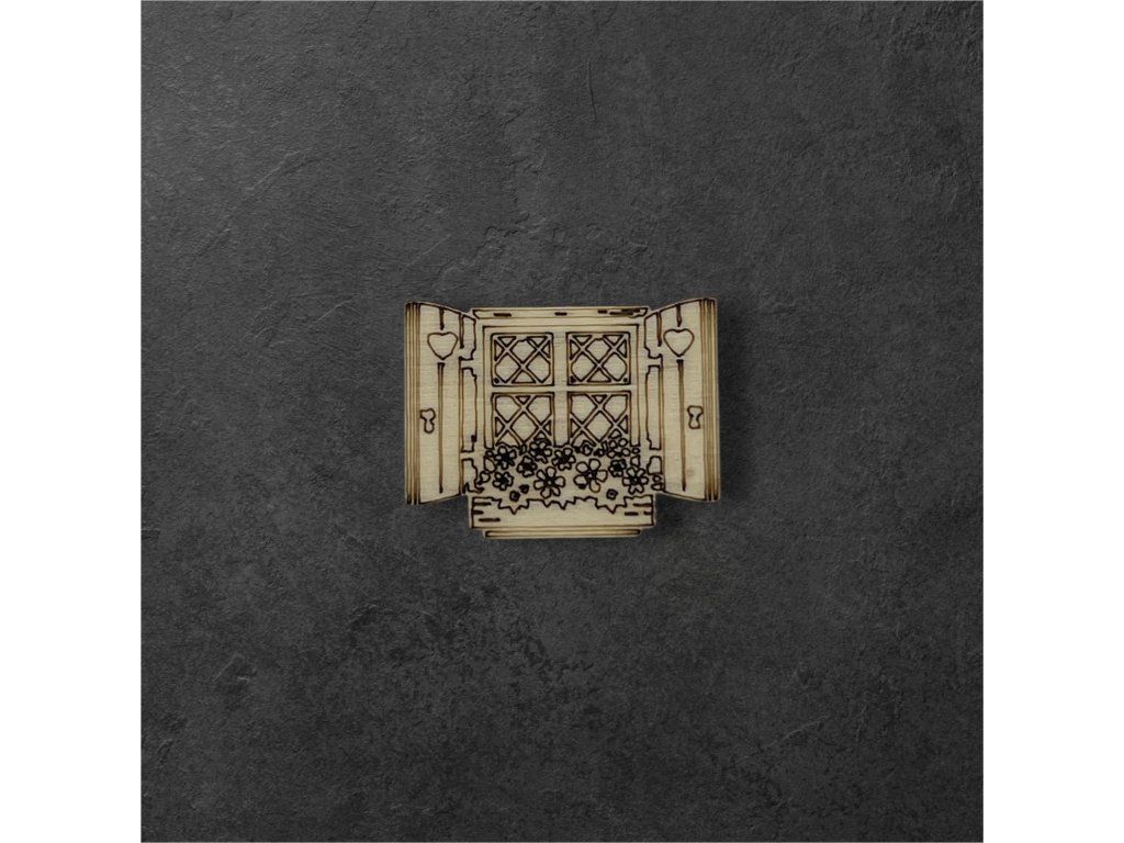 Dřevěný výřez okna s okenicemi, mřížkou a květinovým truhlíkem je detailně propracovaný dekorativní prvek z překližky. Kombinace jemného gravírování, ozdobné mřížky v okně a květinového motivu vytváří výrazný a zajímavý doplněk pro vaše tvoření.