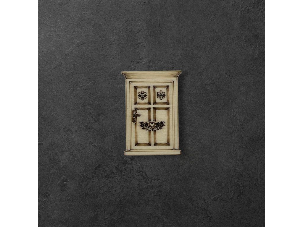 Dřevěný výřez zdobených dveří je detailní dekorativní prvek z překližky, který skvěle doplní vaše domečky a kreativní projekty. Gravírované detaily zvýrazňují jednotlivé části dveří – výplně, madlo i ozdobný motiv se srdíčkem a květinami.