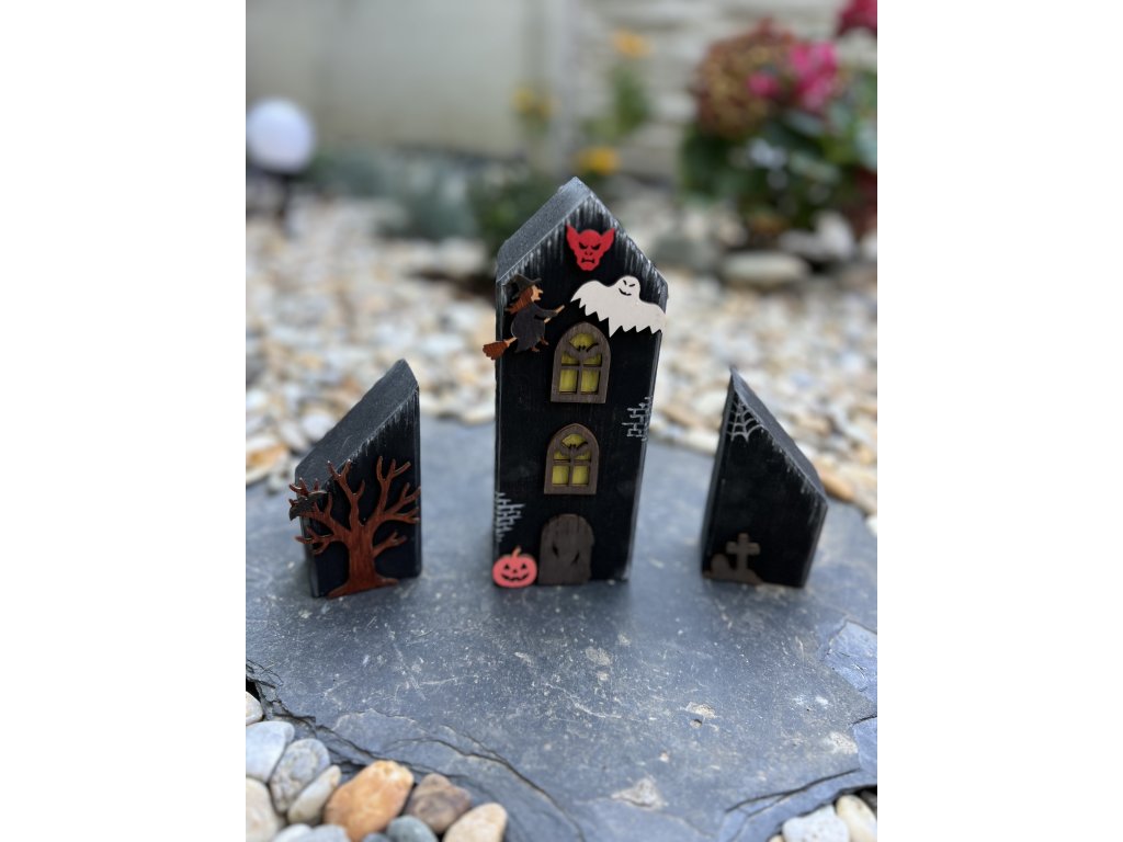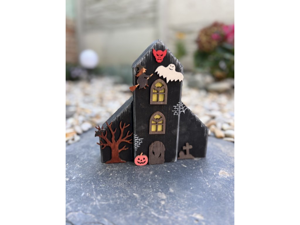 Originální halloween domeček z masivního dřeva, který rozzáří každý domov. Každý kus je pečlivě opracovaný, ručně malovaný akrylovou barvou a zdobený dřevěnými doplňky. Díky ruční výrobě je domeček jedinečný a nese v sobě kus poctivé řemeslné práce.