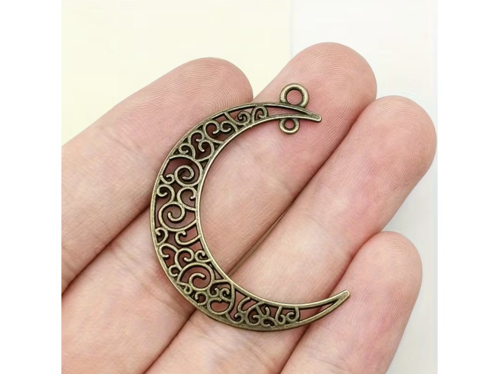Dekorační kovový přívěsek ve tvaru půlměsíce je určen jako komponent pro další kreativní zpracování. Otevřený ornamentální vzor dodává přívěsku výrazný vzhled, který se hodí pro výrobu náušnic, náhrdelníků, přívěsků nebo dalších handmade projektů.