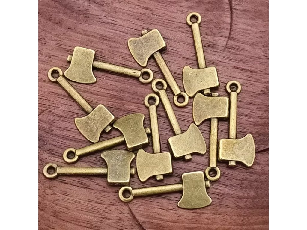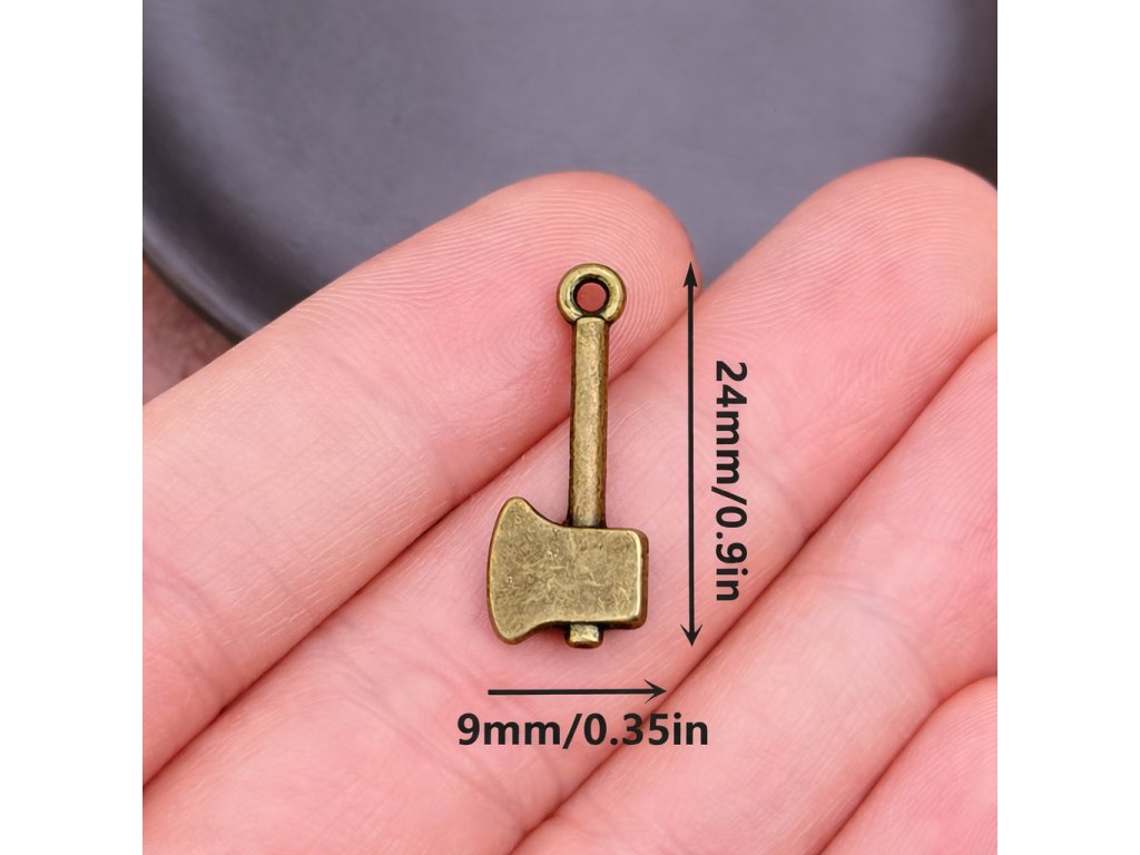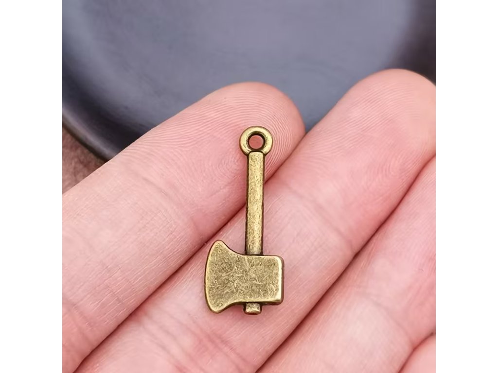 Kovový přívěsek ve tvaru sekery je drobný, ale výrazný doplněk pro kreativní projekty. Hodí se k dotváření domečků, dekorací, macramé, věnců nebo tematických sad. Díky očku v horní části jej lze snadno zavěsit, navléknout nebo připevnit k provázku, drátku či dřevěným prvkům.