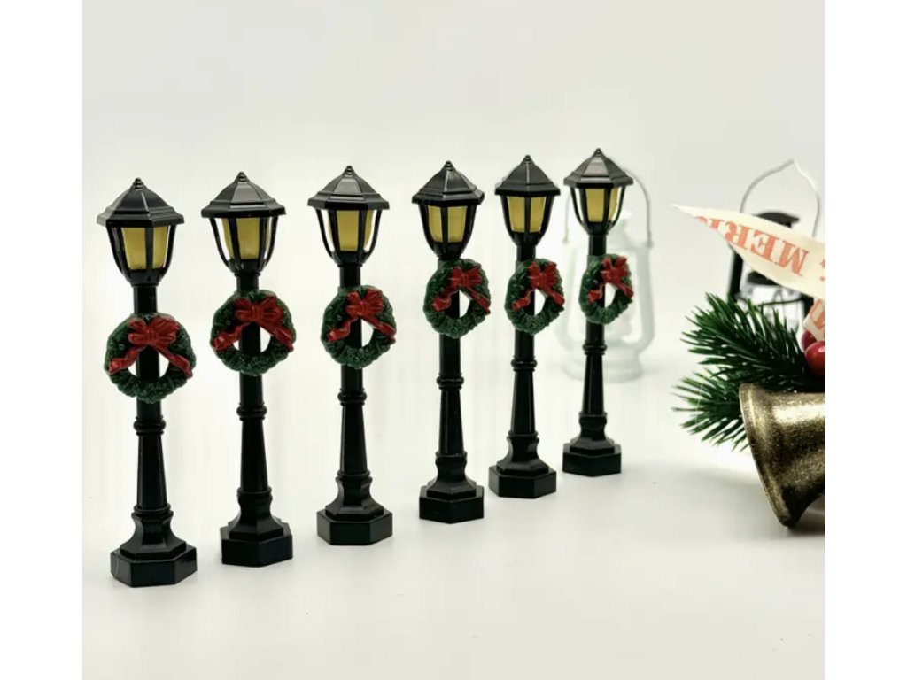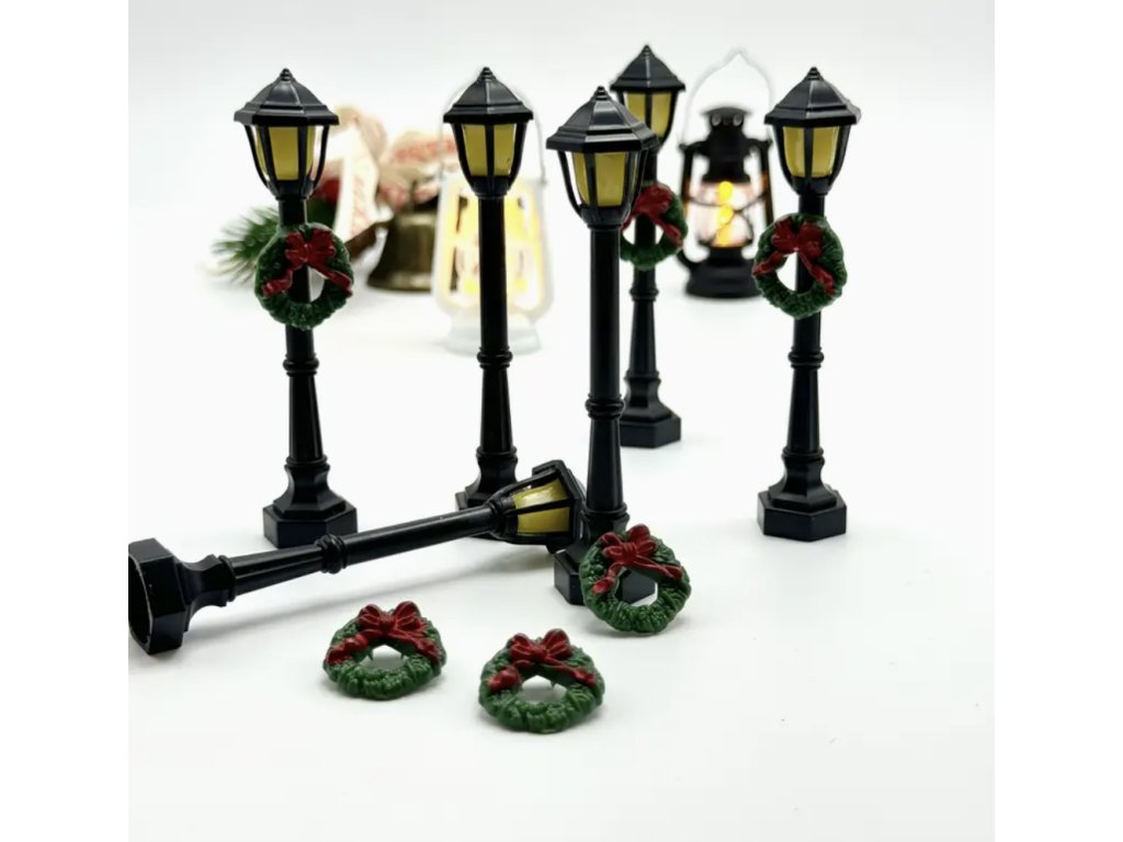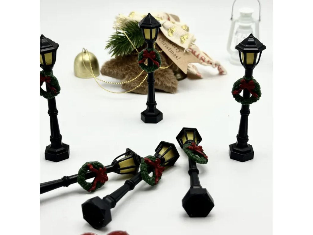 Miniaturní pouliční lampa s připevněným vánočním věncem je ideálním doplňkem pro vánoční dekorace, domečky nebo diorámy.