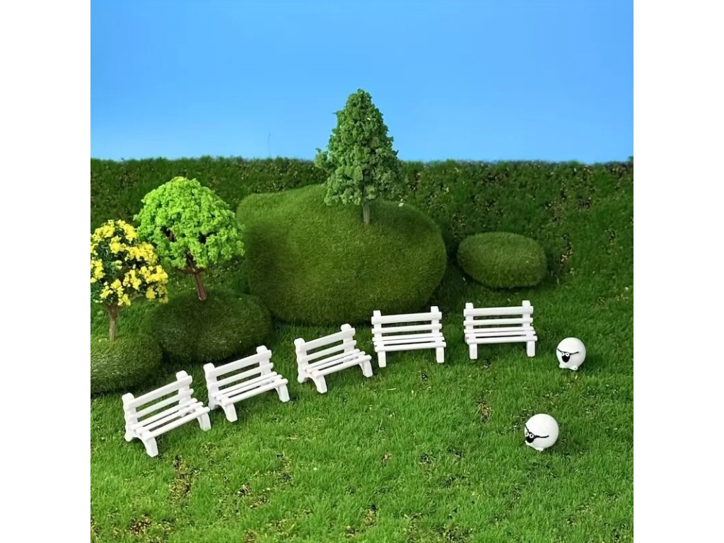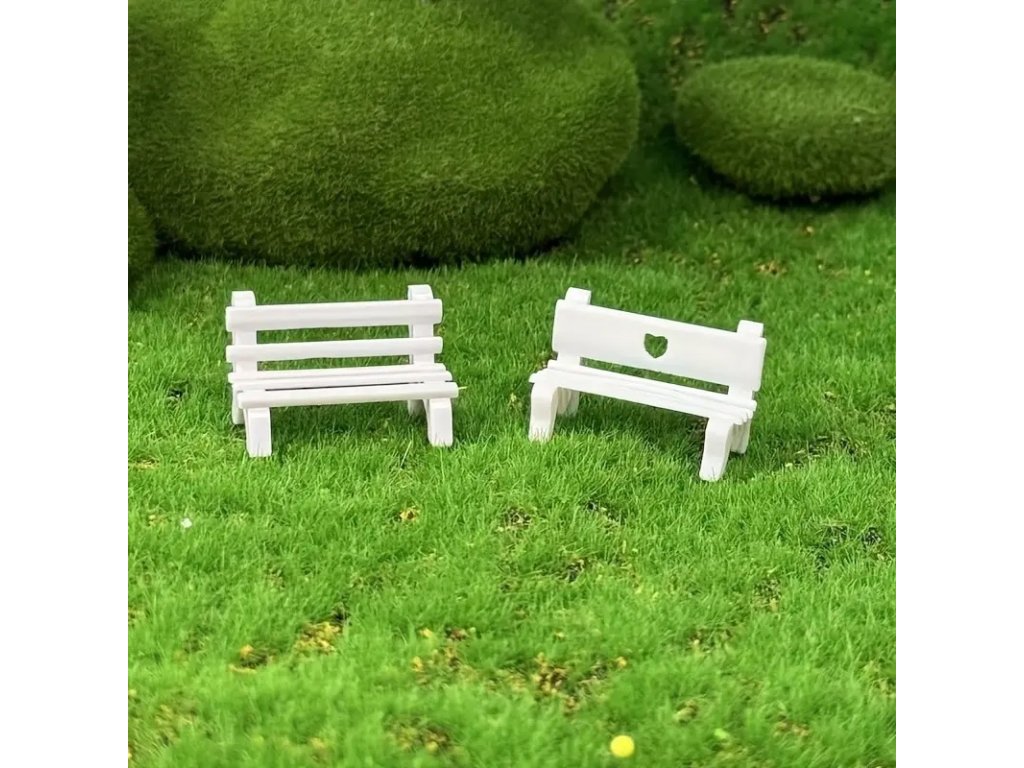 Sada malých laviček z bílého plastu s ozdobným srdíčkovým výřezem. Skvěle doplní dekorace do domečků, miniaturních zahrad, betlémů, dioramat, květináčů i terárií. Díky detailnímu zpracování působí realisticky a hodí se pro nejrůznější kreativní projekty.