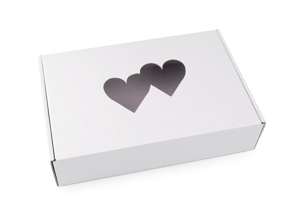 Papírová krabice s průhledem – srdce, bílá