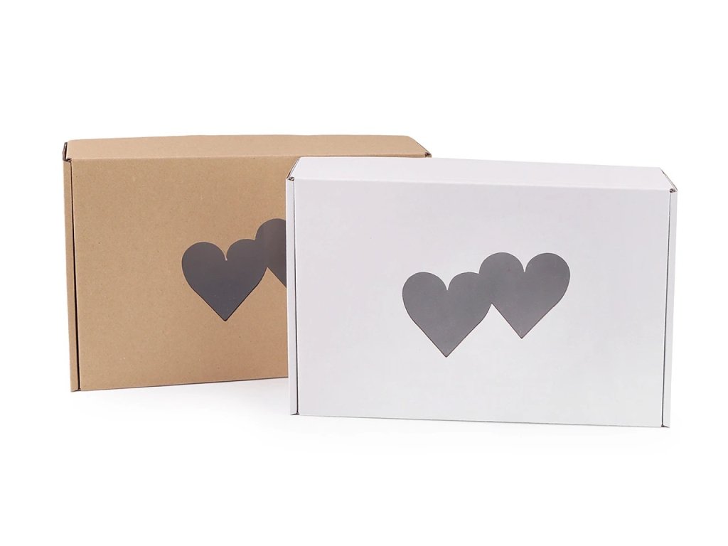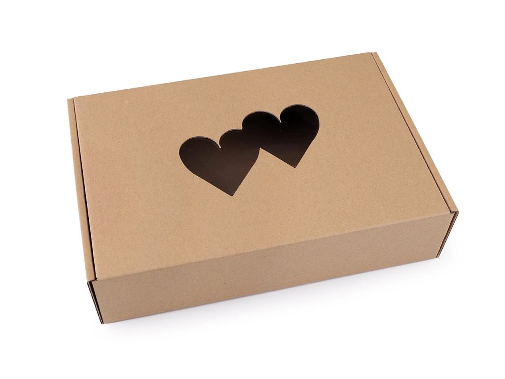 Papírová krabice s průhledem ve víku je určená pro balení dárků a hotových výrobků. Výřez ve tvaru dvou srdcí je z vnitřní strany podlepený průhlednou fólií, která umožňuje nahlédnout na obsah a zároveň jej chrání.