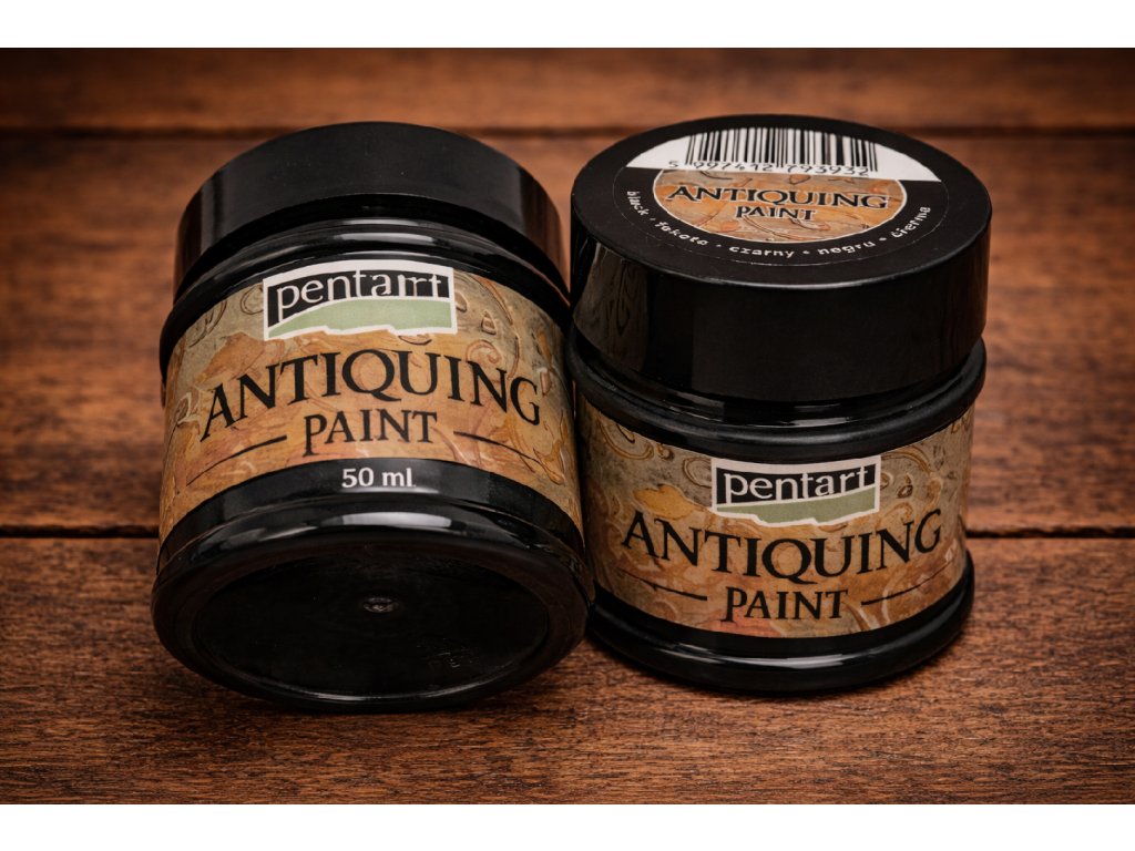 Antikovací barva Pentart v černé barvě je dekorativní barva určená k patinování a zvýraznění struktur, reliéfů, hran a povrchových detailů. Slouží k vytvoření výrazného antikovaného a lehce opotřebovaného vzhledu, který dodá dekoracím hloubku a kontrast.