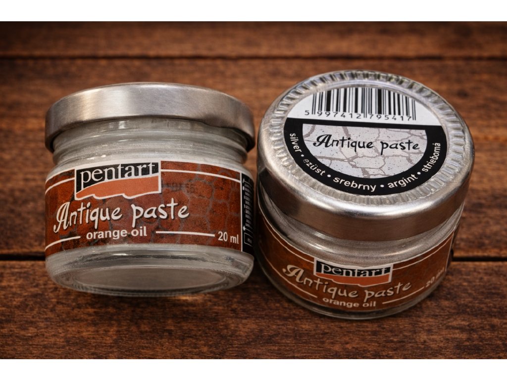 Antikovací pasta Pentart ve stříbrné barvě je husté dekorativní médium na bázi rozpouštědel, určené k patinování a zvýraznění detailů. Vytváří jemný kovový a antikovaný efekt, který dodá povrchu přirozený vzhled opotřebení a hloubku.