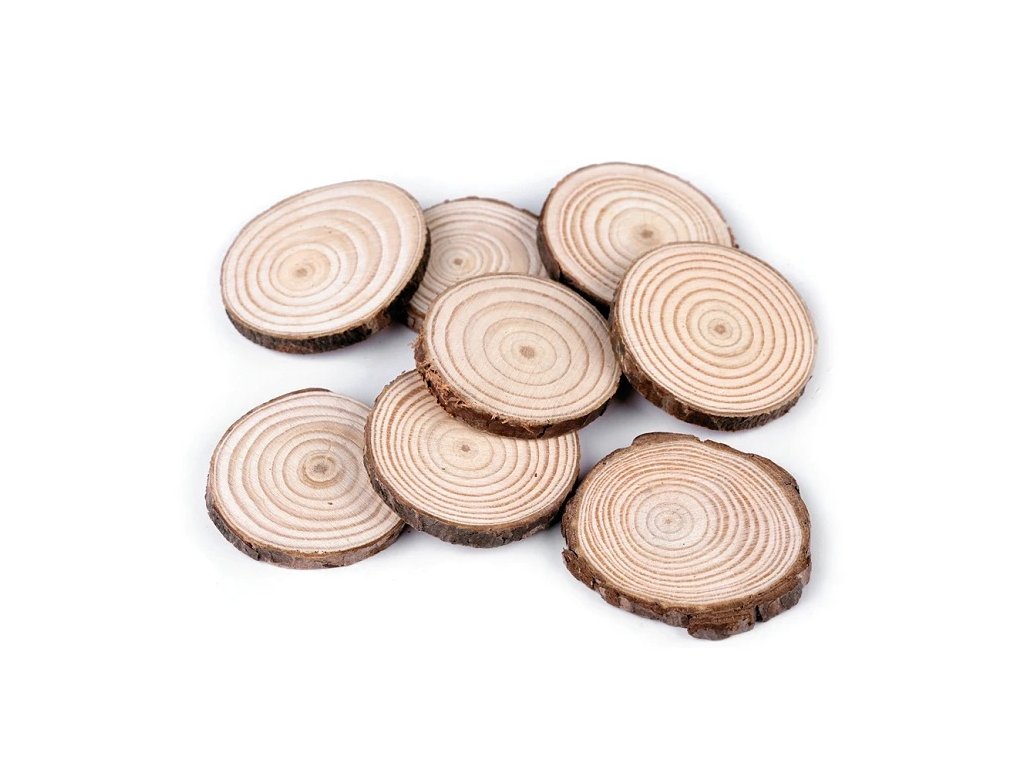 Přírodní dřevěná kolečka se skvěle hodí k dalšímu dotvoření. Každé kolečko je originál – liší se barvou, kresbou dřeva, velikostí i tloušťkou. Kolečka jsou rovná, po obvodu mají kůru a nejsou nijak barvená ani lakovaná.