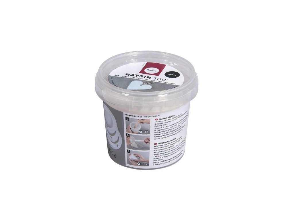 Raysin 100 od značky Rayher je prémiový odlévací materiál podobný modelářské sádře, ale s mnohem lepší pevností a hladším povrchem. Je čistě bílý, bez zápachu a díky svému složení (přírodní síran vápenatý) vhodný i pro tvoření s dětmi.