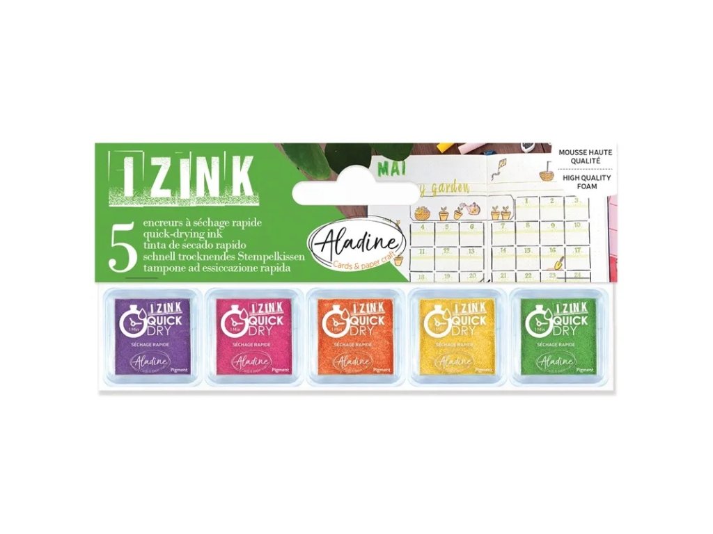 Sada razítkovacích polštářků Aladine obsahuje pět odstínů inspirovaných letní paletou, ideální pro tvoření svěžích a barevných papírových projektů. Polštářky mají velikost 2,5 × 2,5 cm a jsou navrženy pro razítkování na papír.
