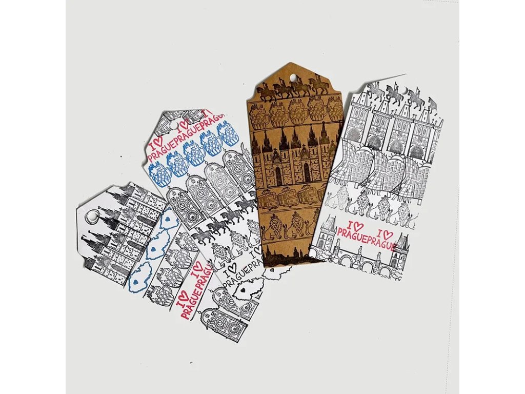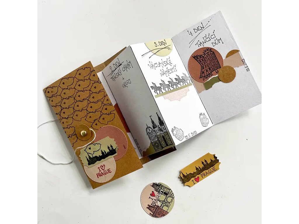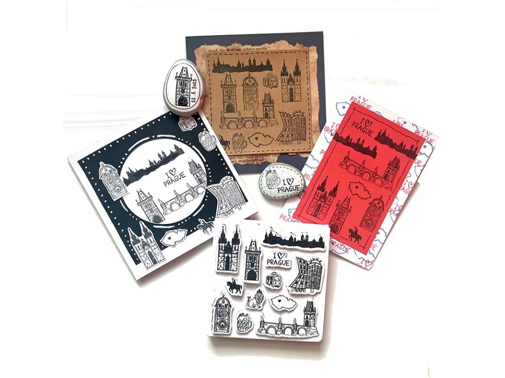 Sada 12 razítek s motivy Prahy pro kreativní tvoření a dekorace.