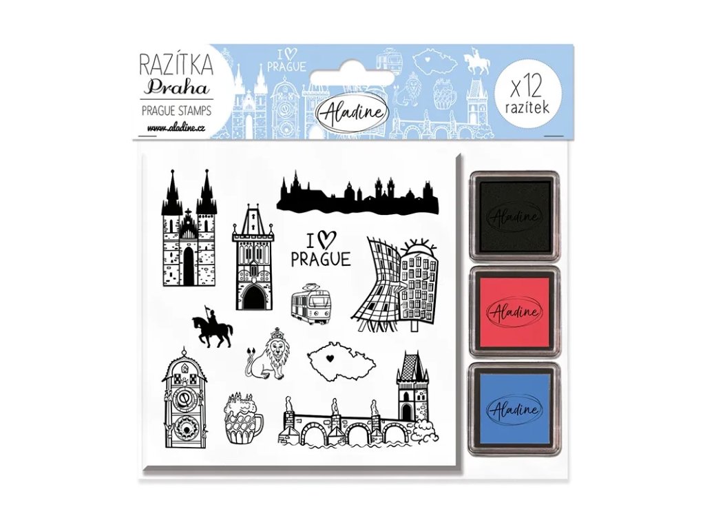 Sada razítek Aladine Stampo City obsahuje 12 kvalitních razítek s motivy Prahy, která jsou vhodná pro kreativní tvoření. Razítka můžete používat při zdobení diáře, bullet journalu, přáníček, pozvánek či jiných papírových projektů.