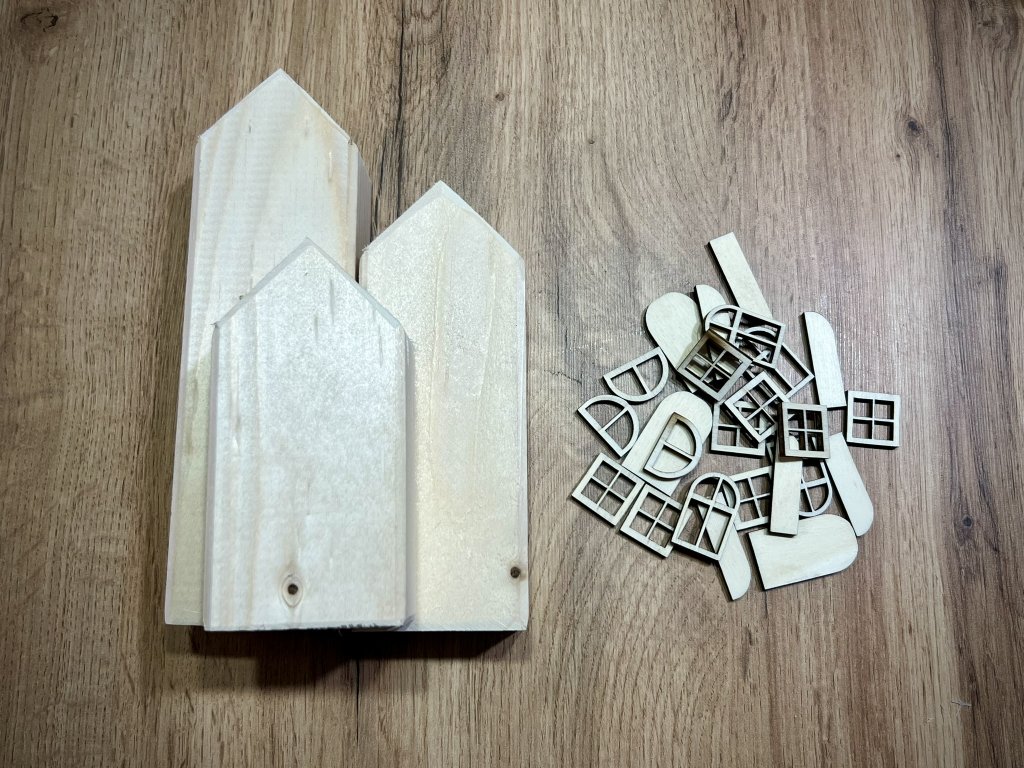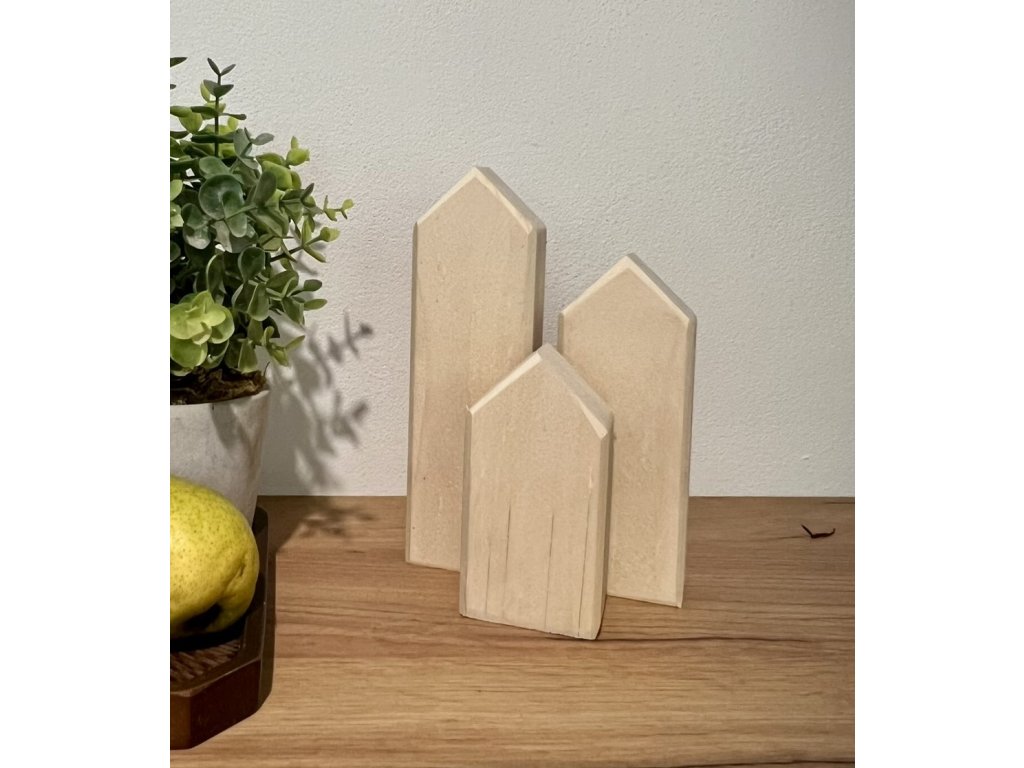 Tato sada obsahuje tři dřevěné domečky z masivu o rozměrech 4×6 cm s výškami 12 cm, 16 cm a 20 cm. K nim patří sada doplňků z topolové překližky – 3× dveře a 10× oken, které nejsou k domečkům připevněné a jsou připravené k vlastnímu dotvoření.