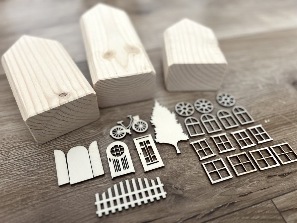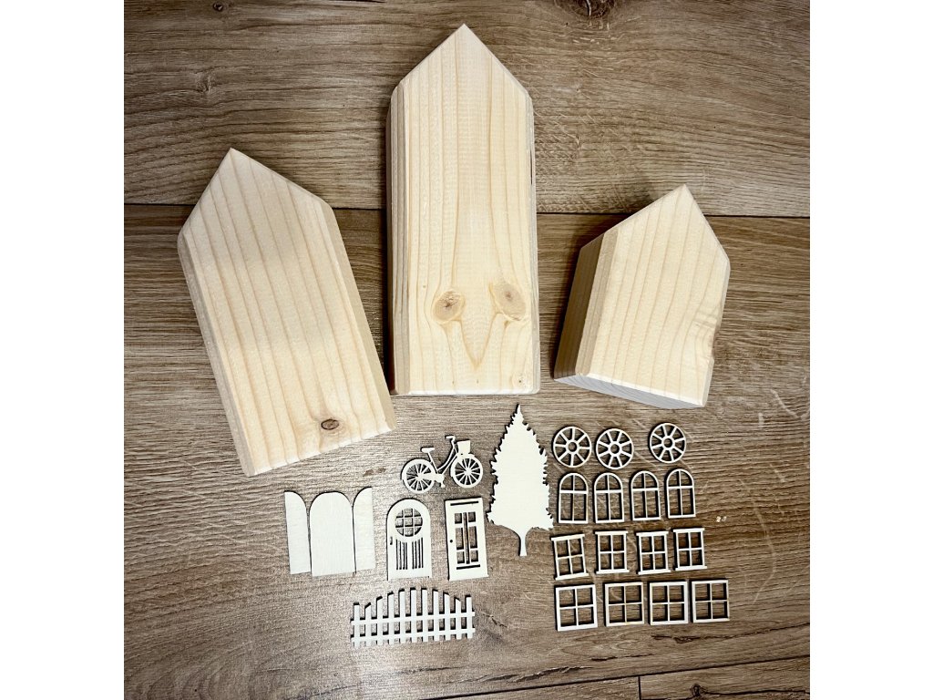 Tato sada obsahuje tři dřevěné domečky z masivu o rozměrech 4×6 cm s výškami 12 cm, 16 cm a 20 cm. K nim patří sada doplňků z topolové překližky které nejsou k domečkům připevněné a jsou připravené k vlastnímu dotvoření.