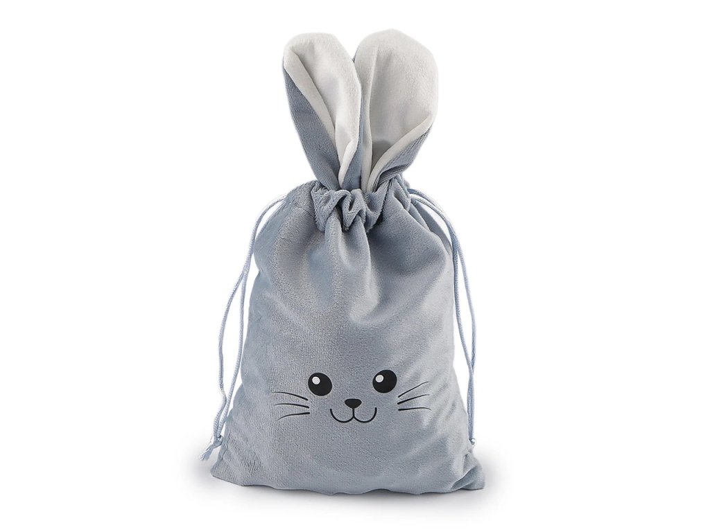 Pytlík má dekorativní uši, potisk obličeje a na zadní straně bambulku ve tvaru ocásku. Snadno se uzavírá pomocí dvou saténových stahovacích šňůrek. Hodí se zejména pro velikonoční balení, dětské oslavy nebo jako dárkový obal pro drobnosti během celého roku.