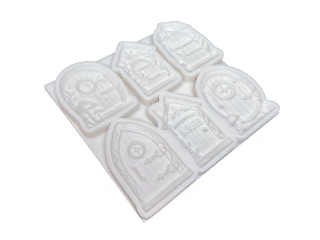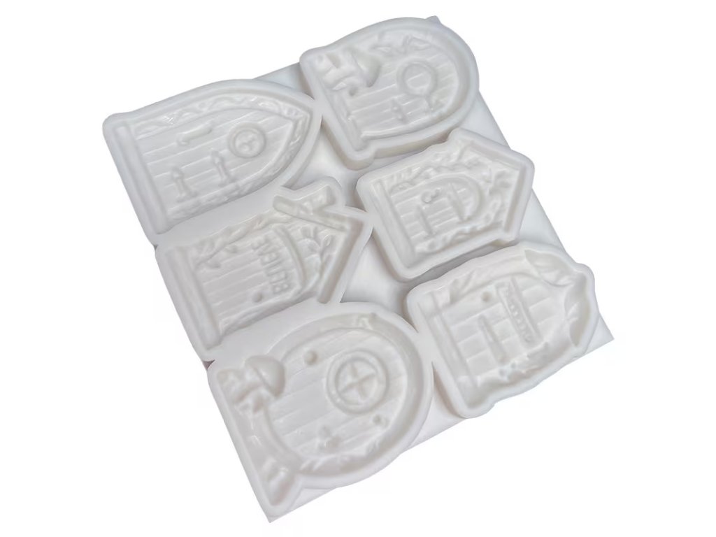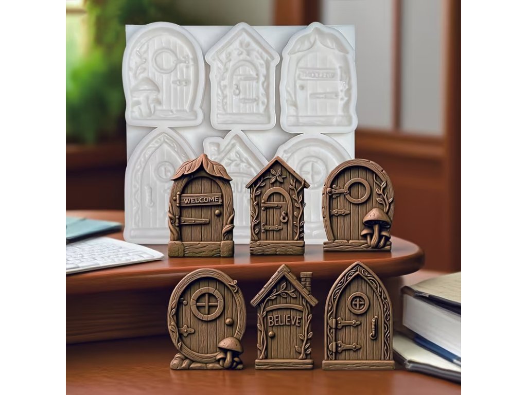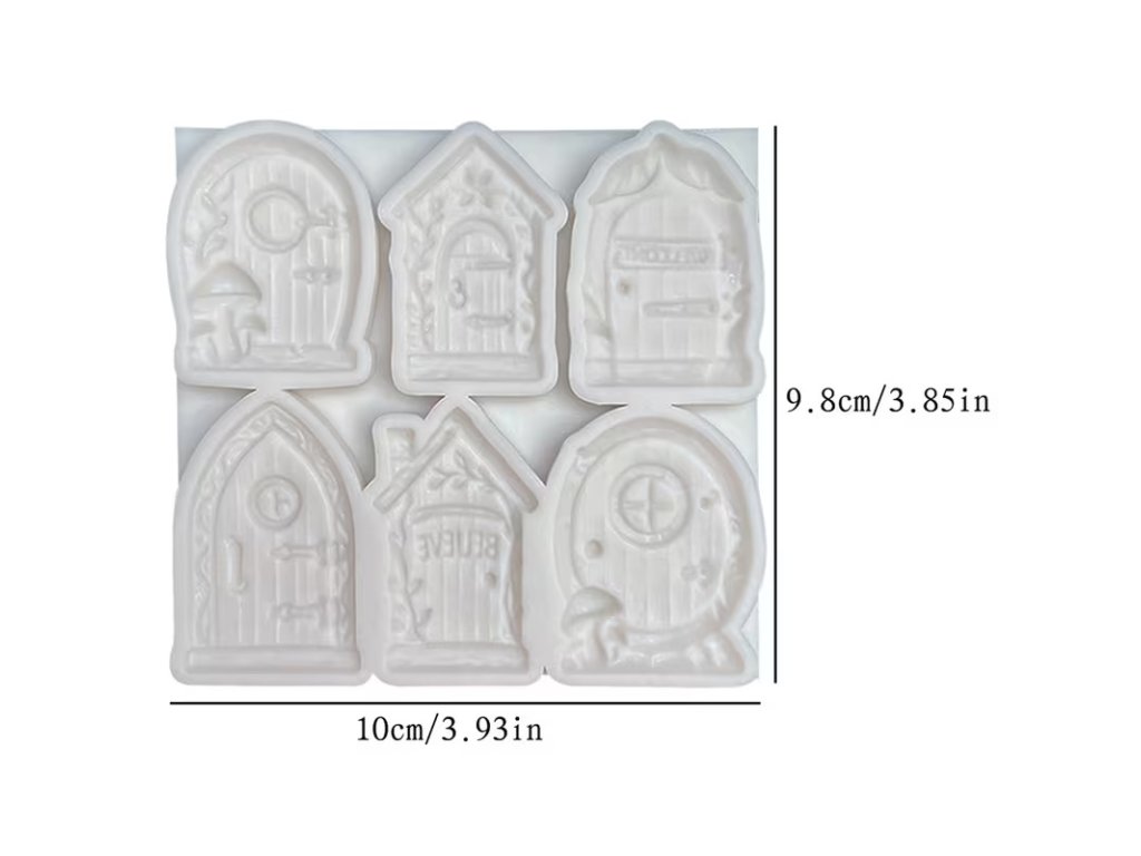 Silikonová forma s motivy šesti různých mini dvířek, které jsou ideální pro výrobu drobných dekorací do domečků, zahradních scenérií, vílích dekorací i kreativních projektů. Každý tvar má jemné detaily – dřevo, okénka, houbičky, nápisy – a díky měkkému silikonu se hotové výrobky jednoduše vyjímají.