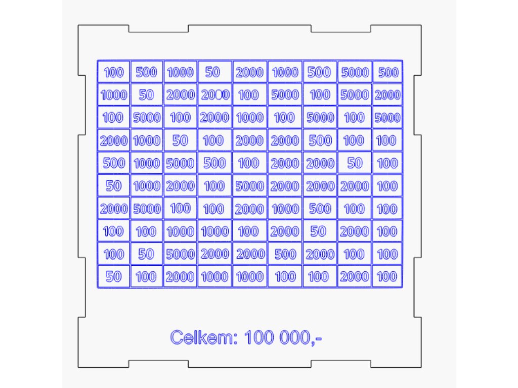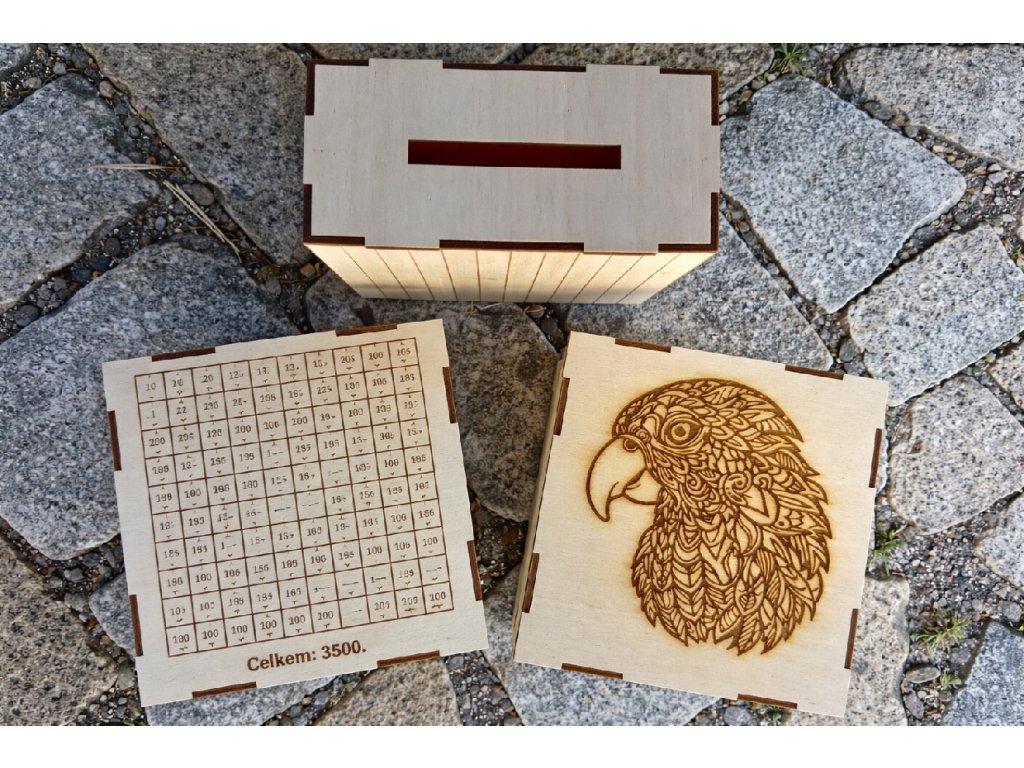 Praktická dřevěná pokladnička vyrobená z 3mm topolové překližky. Pomocí obyčejné tužky si jednoduše zaznačíte každou vloženou bankovku a máte tak neustálý přehled o naspořené částce.