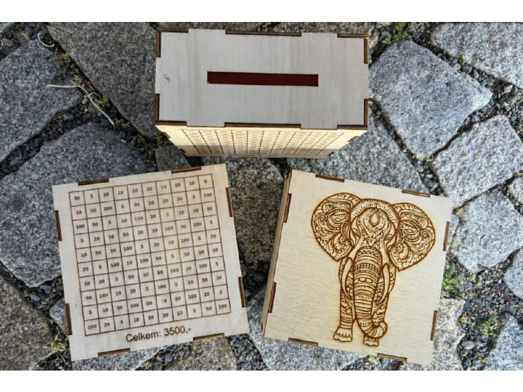 Praktická dřevěná pokladnička vyrobená z 3mm topolové překližky. Pomocí obyčejné tužky si jednoduše zaznačíte každou vloženou bankovku a máte tak neustálý přehled o naspořené částce.