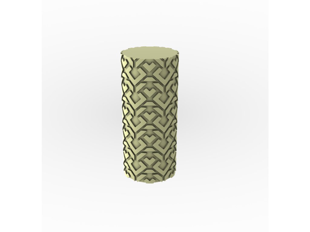 Strukturovaný váleček s geometrickým vzorem je určen k vytváření výrazné, pravidelné struktury na povrchu hmoty. Vzor je tvořen ostrými liniemi a opakujícími se tvary, které působí moderně a technicky přesně.